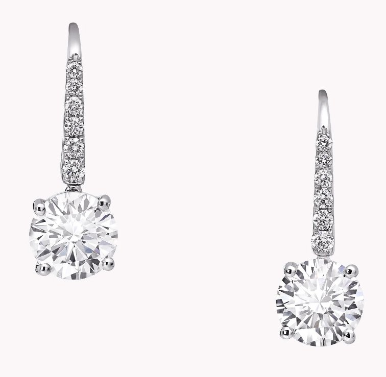 This pair of diamond drop earrings are prong-set with round diamonds leading down to a starburst of brightness on the main solitaire that dangles below. Shown at 2.00 carat total weight, but available larger sizes with pricing starting at $2,800 and up.
