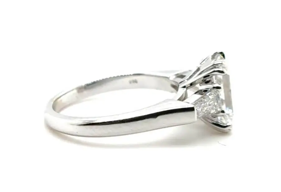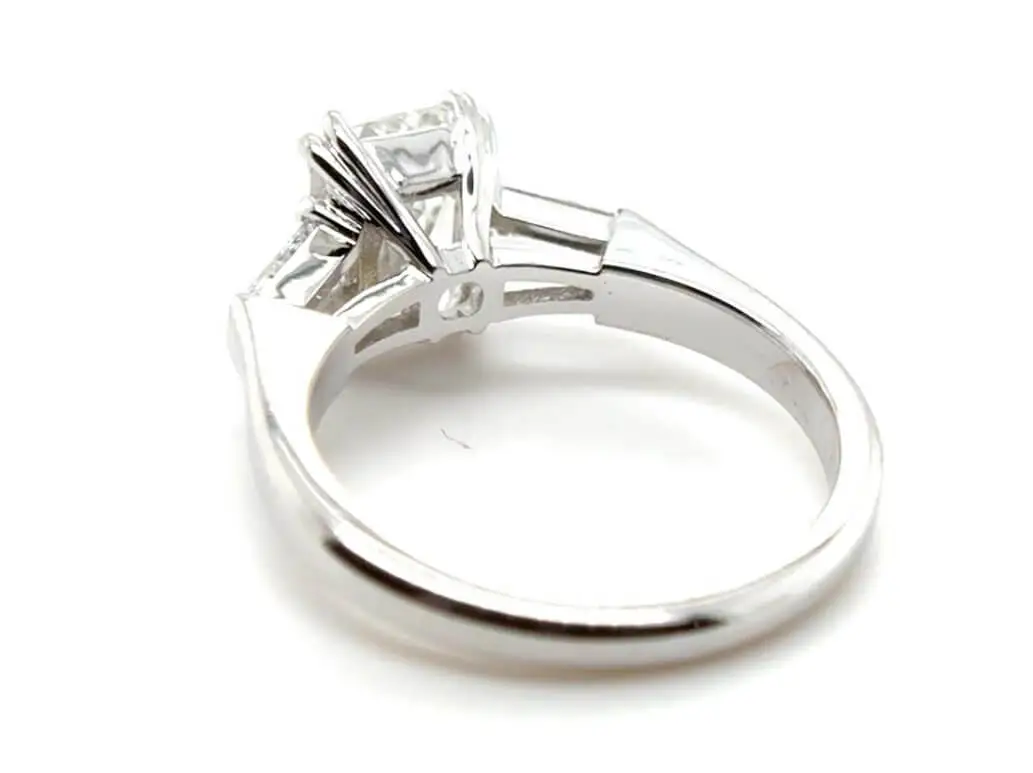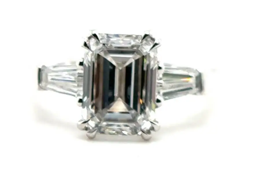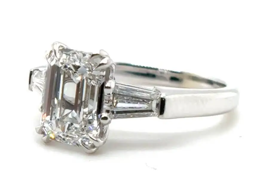 Emerald cut center diamond ring with a matched pair of step-cut tapered baguette side diamonds set into a traditional 1960s style platinum ring mounting. Pricing from $2,000 and up.