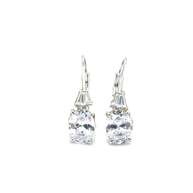 925 sterling silver with Oval cubic zirconia with shield cut CZs set on a lever back earring.